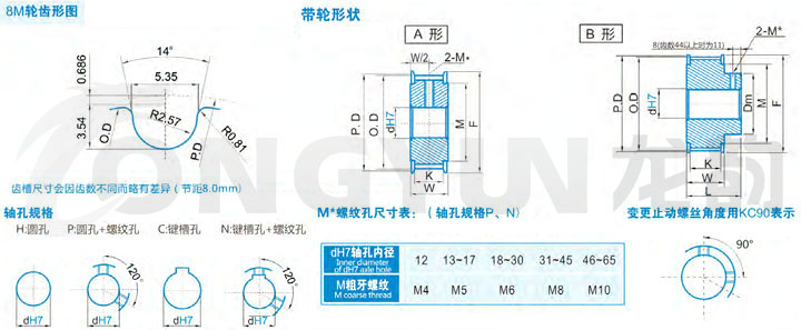 規格 形狀 節徑P.D 外徑O.D 擋邊外徑F 擋邊內徑M 輪轂直徑Dm 內孔dH7