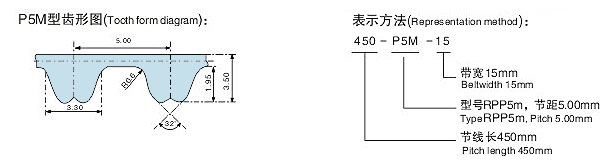 RPP5M橡膠單麵齒同步帶設計參數:齒形為齒型為兔牙型,轉彎效果好,適合高速傳動。
