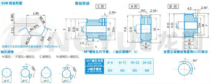 | 規格 | 形狀 | 節徑P.D | 外徑O.D | 擋邊外徑F | 擋邊內徑M | 輪轂直徑Dm | 內孔dH7 | |||||